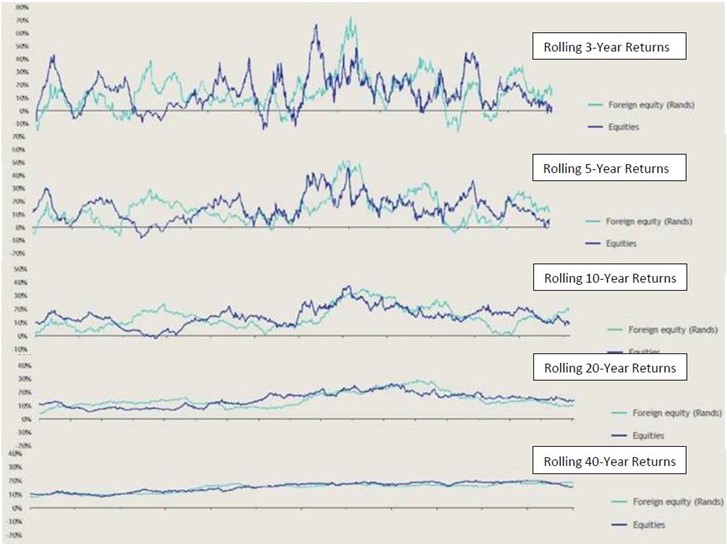 Have a look at the charts below which show rolling returns from foreign and local equities over various periods since 1934 (with thanks to Karl Leinberger of Coronation Fund Managers):