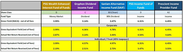 With that in mind, I am pleased to provide a comparison of rates currently offered by our market-leading money market fund (the PSG Wealth Enhanced Interest FoF), two dividend income funds (the Gryphon Dividend Income Fund and the Sanlam Alternative Income Fund) which offer returns as dividends which is more tax-efficient for a company or a higher-rate individual or trust taxpayer and two income funds - the PSG Income Fund of Funds and the Prescient Income Provider, which holds shorter- and medium-term bonds to boost returns. In the case of the latter, this means that it is prudent to hold the fund for a minimum of 6 months.