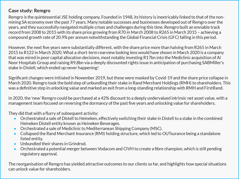 At PSG Asset Management, we are firm believers that there are always opportunities for astute investors. Special situations are a case in point, where investor outcomes are not dependent on overall market returns. Our idea generation process loves special situations, an area we have had considerable success with. By carefully combining shares driven by various sources of return, we believe we can construct robust portfolios that are well suited to navigate a variety of market environments. Special situations form a valuable component of our equity investment toolkit and have added substantially to our investment performance over time. We look forward to seeing how our existing book of special situation investments unfolds over the coming years.