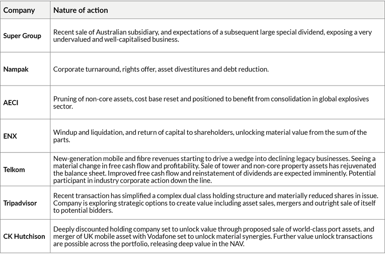 In particular, we find that our 3M investment process is well positioned to unlock the value on offer from special situations, since it leads us to find opportunities with inherently attractive characteristics that the market is missing. Specifically, special situations are often not fully reflected in valuations, and can help add a margin of safety to the holdings that make them more attractive. This margin of safety is considered together with the quality aspects of our process - the management and moat assessments. Our preference for doing our own, independent research provides another unique advantage, as fully unpacking the impact of special situations requires a detailed analysis of the company in question. As such, our team has a track record of extracting alpha in this space. Previous highlights include enjoying the fruits of corporate transactions in Imperial Logistics, Long for Life, Royal Bafokeng Platinum, Old Mutual’s managed separation, Prudential plc’s demerging of M&G plc and Jackson Financial, and Woodside’s merger with BHP’s energy assets, to name a few.