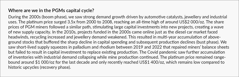 Roughly 70% to 80% of global PGM primary production originates from South Africa and the sector is a material contributor to the local economy. Importantly, PGM supply has been in decline for the past 15 years. South Africa’s platinum production peaked at 5.3 million ounces (Moz) in 2006. Since then, capital investment into new mines has added around 2 Moz of new supply. However, by 2025, total production is expected to be just 3.6 Moz. Declines in older mine production have more than offset new supply added in the past 20 years. In the box below, we delve into more detail on the PGM cycle.