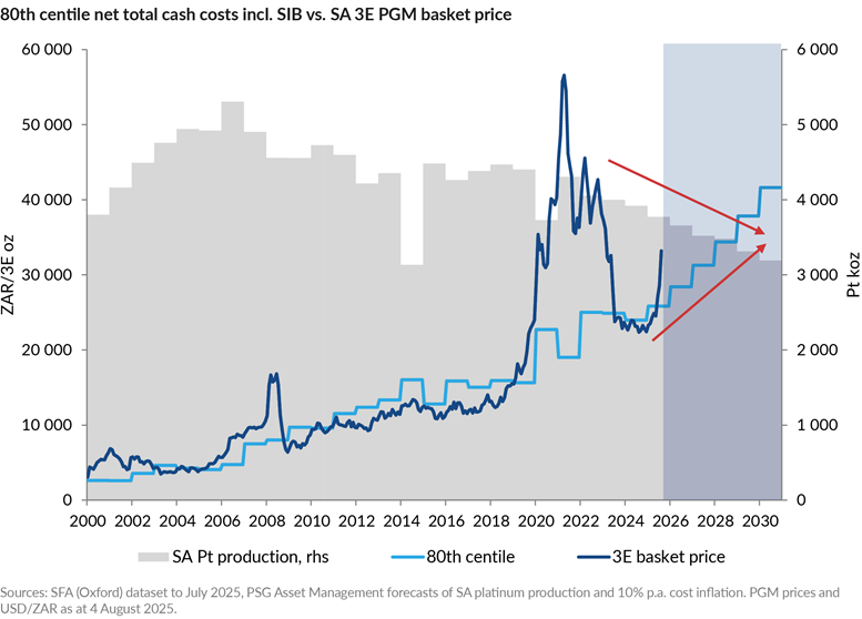Current cost support levels (80th percentile net total cash costs including stay-in-business (SIB) capital expenditure) are around R26k/oz for the 3E basket of PGM metals. At a reasonable (below historic trend) cost inflation scenario of 10% p.a. (elevated by electricity prices), costs will likely be around 60% higher by 2030. This cost base inflation sets the bar for future 3E basket price levels to be at a minimum close to sustainable. Given the current supply-side setup, it’s unlikely that the basket price can stay below the cost support level for an extended period of time, as was the case during the 2010s.