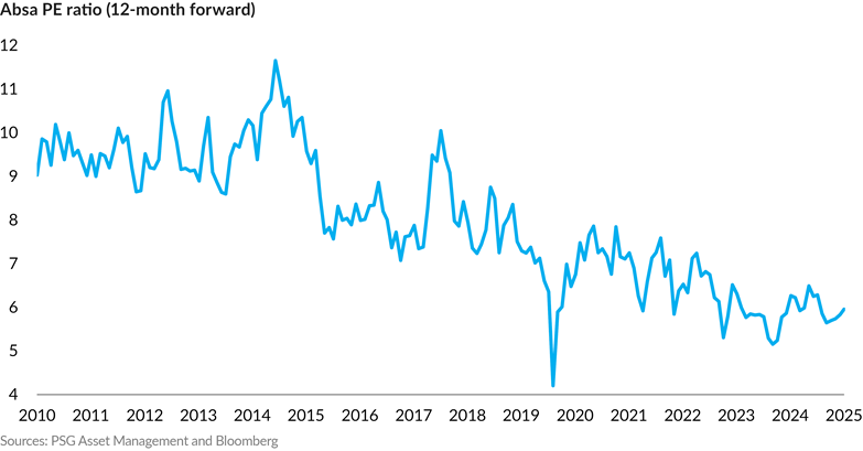 Despite the rally, many constituents of the South African market offer attractive value. The largest SA Inc. sectors are the banks, and across the banks, the cheapest one on traditional valuation metrics is Absa. Absa trades on a 6x PE and 8% dividend yield (not far removed from the yield currently received on the 10-year SA government bond, which has rallied sharply in recent months). The dividend per share has compounded by 7% p.a. over 15 years from 2010 to 2025, a period that has been tough for South Africa and where the term ’polycrisis’ was appropriate. If that dividend growth can be maintained, Absa offers a 15% total return absent any positive rerating in the PE ratio, which at a starting multiple of 6x carries a reasonable probability.