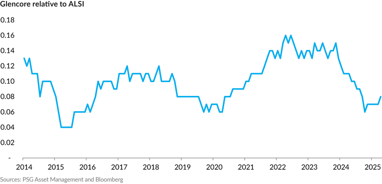 Undervaluation is not only evident in SA Inc. In the diversified mining sector, Glencore is also undervalued. The stock is trading at lows relative to the market, at similar levels to 2020, and has only been cheaper in 2015 when the balance sheet was much weaker than it is now.