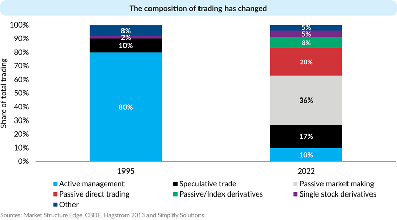 The chart below by Simplify Asset Management shows an estimate of the change in US equity trading by source. Simplify believes that active management-originated trades declined from some 80% of the total in 1995 to only 10% in 2022.