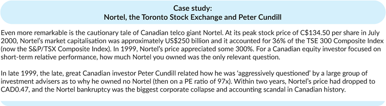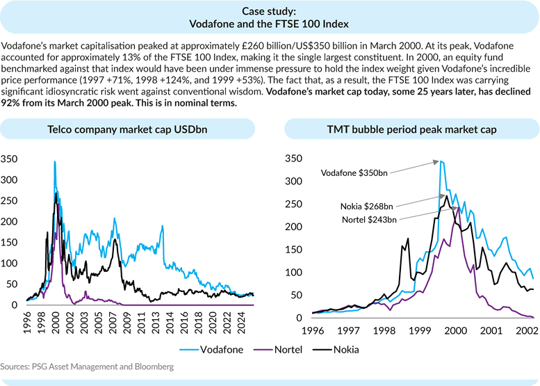 It is fair to say the current levels of index concentration calls into question whether the S&P 500 Index and MSCI World Index are still effective benchmarks. This means passive investors are effectively taking very substantial idiosyncratic risk, and by implication, the output of most quantitative risk models using these benchmarks should at the very least be viewed with a common-sense overlay. The importance of this will be highlighted by our case study below, which focuses on a previous occasion when benchmark indices became overly concentrated.