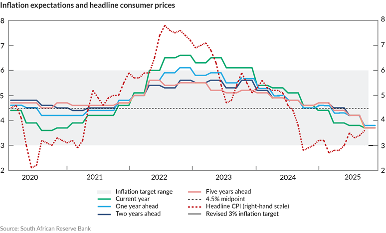 Although the adjusted target was only announced in November 2025, inflation expectations for the next 1 to 3 years have already moved much lower (refer to the chart below), indicating a successful reframing of the inflation outlook in the SA context.