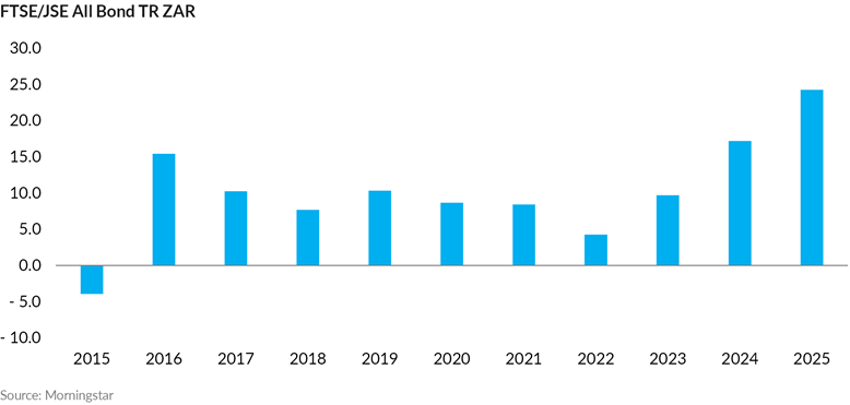 Lower inflation and (cautious) rate cuts by the SARB have positively impacted asset prices: equity and fixed income markets have performed well. South African nominal government bonds have seen two of the most impressive years in history. Returns on South African government bonds (proxied by the All Bond Index (ALBI)) amounted to 17% in 2024 and 24% in 2025.