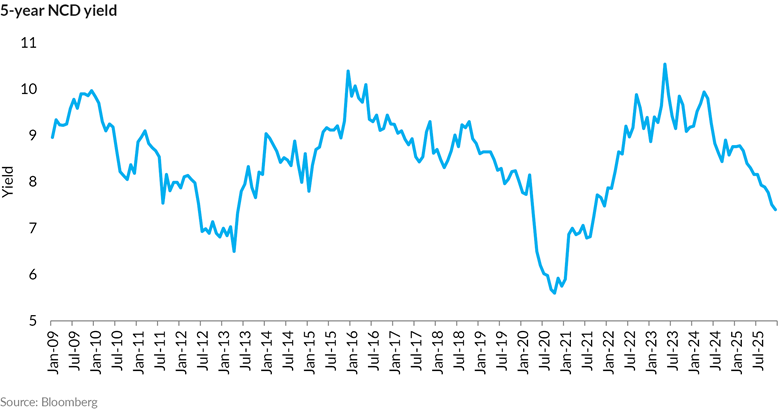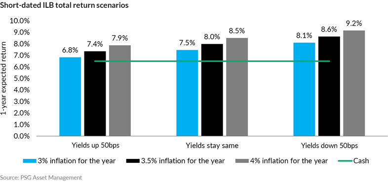 These instruments currently offer a real yield of 4.2% – but is this enough to compensate for an environment where inflation is low? We think so. As the next chart highlights, even if inflation stays at 3% over the next year (the December 2025 inflation print was 3.6%) and yields increase by 50 basis points, returns on these ILBs would still equal the return available on cash (currently yielding 6.5%). And if ILB yields compress and/or inflation prints higher than 3%, these ILBs are likely to outperform cash by a significant margin. This makes it likely that we will achieve returns equivalent to those available on NCDs, while enjoying inflation protection and upside potential.