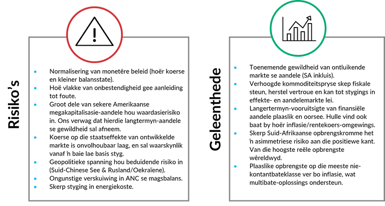 Waarskynlik die belangrikste faktor om vanjaar, en die volgende paar jaar, dop te hou, is inflasie – gevolg deur stygende rentekoerse. In 2021 het ons ʼn skielike en skerp styging in inflasie gesien, as gevolg van die herstel van ekonomiese aktiwiteit wêreldwyd, en bottelnekke in die internasionale verskaffingsketting.