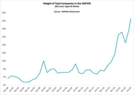 Weight of the top three largest companies (Microsoft, Apple & Nvidia) in the S&P 500 Index