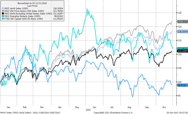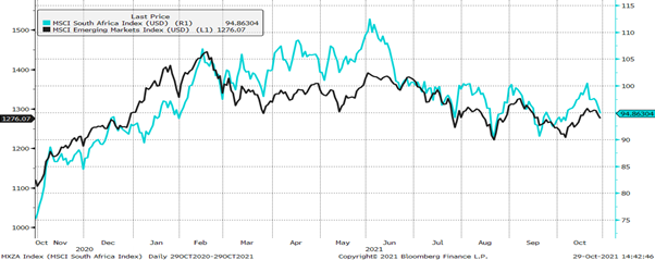 Ondanks ons eie plaaslike probleme soos inperkings, Eskom en onluste, het die plaaslike mark oor die afgelope jaar verrassend genoeg beter gevaar as die ander ontwikkelende markte, soos hieronder gesien kan word.
