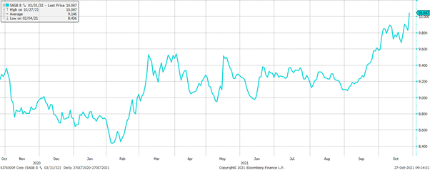 Plaaslike effektekoerse het die res van die wêreld gevolg met ʼn effense styging in die risikopremie aan die einde van Oktober, moontlik as gevolg van die onsekerheid rondom die plaaslike verkiesing. Onthou, hoe meer onseker beleggers is, hoe hoër is die opbrengs wat hulle wil hê om vir die risiko te vergoed. Dus lei onsekerheid tot ʼn effens hoër styging in plaaslike koerse vergeleke met internasionale koerse.